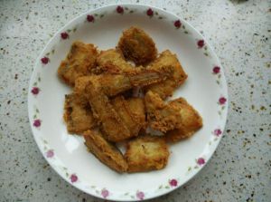 将带鱼洗净切块,放盐,花椒,料酒,胡椒粉腌制20分钟,裹蛋液下锅煎炸至金黄盛出。