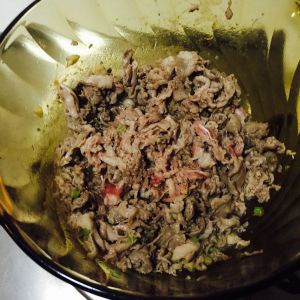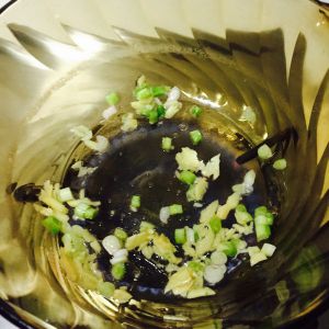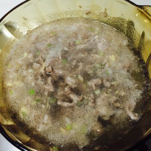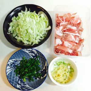 所需材料。羔羊肉片是现成的。银丝白切丝。葱切碎,只用了葱白。姜拍成蓉。