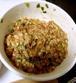 猪肉陷里放十三香,适量的盐,生抽和老抽.生粉,葱姜,和一点点水,充分搅拌均匀