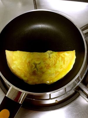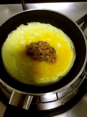 在蛋液还没有凝固的时候放入肉馅,再对折
