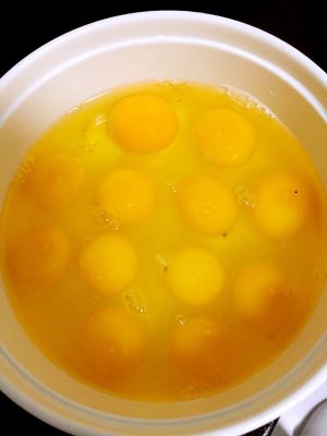 准备12个鸡蛋,打成蛋液,里面加入5克淀粉水,3克盐