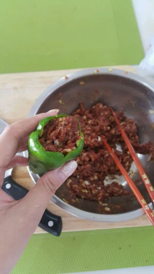 葱,姜,盐,味达美放入肉馅,拌匀腌制一会,辣椒把梗部切掉,去除辣椒籽,然后塞满腌制好的肉馅。