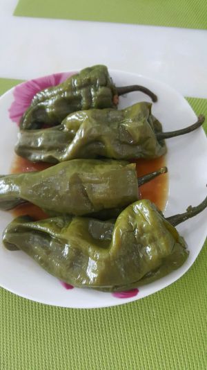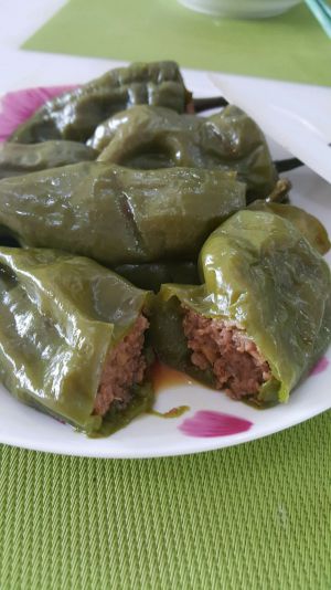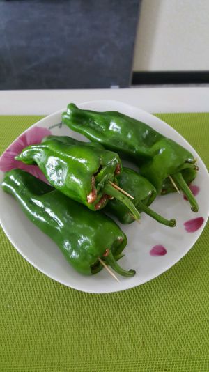 用牙签固定好辣椒。我用的肉馅不多,所以只做了四个。