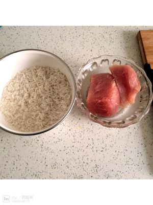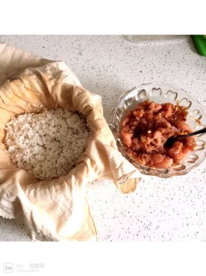 猪肉剁碎,调馅。馅里面放料酒,生抽,老抽,蚝油,最后放淀粉。大米控干水分。