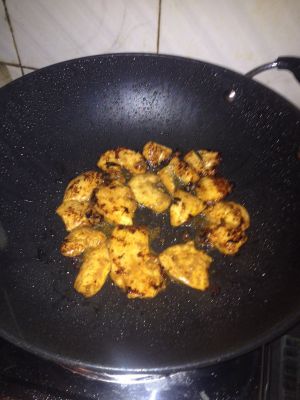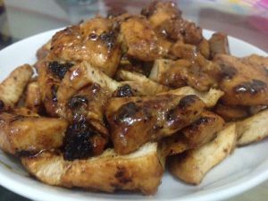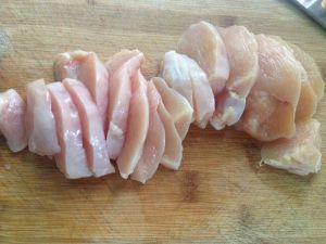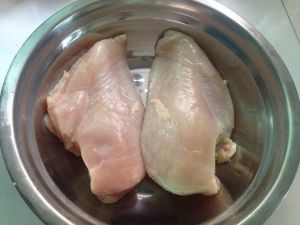 少许料酒、芡粉,适量烤肉酱与鸡胸肉和匀,包上保鲜膜放冰箱腌制半小时以上