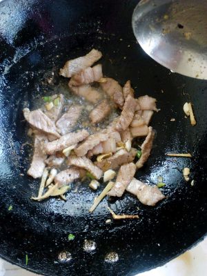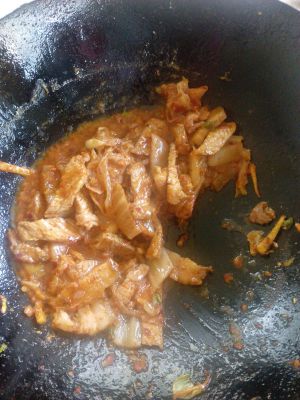 肉热后放入葱姜蒜炒香,在放肉下锅煸炒下放入泡菜