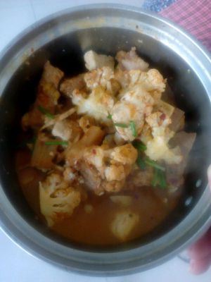 放入自己喜欢的蔬菜,没有其他菜就放了菜花,煮熟放入盐等调味品就可以出锅了