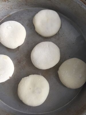 像包蒸包一样,大小适中的剂子擀薄,包入肉馅,收口的地方朝下,压扁,锅内刷层油,热后放入肉饼,小火煎至两面微黄,到适量清水,马上盖上锅盖,水干后出锅