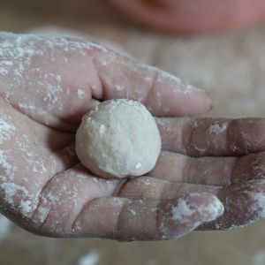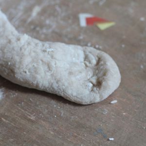 搓成条,然后一端拉长,拍成扁平的凹状,用来放馅。