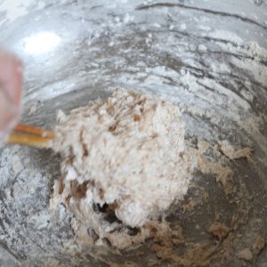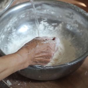 将碎好的粉倒入盆中,同步将水可以烧好,后面和面必须要用沸水和面