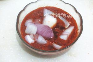 用水冲开调料,加入洋葱,把猪排放进去,封上保鲜膜在冰箱腌制一夜
