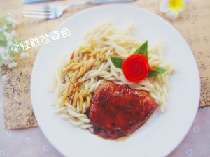 进行摆盘,猪排通心粉放入盘中浇上做好的黑胡椒汁