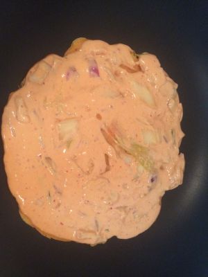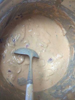 切件辣白菜+面粉+鸡蛋+水 混合成糊状…家里有剩的洋葱也切碎放了一点