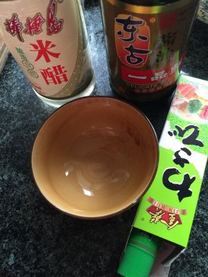 调制芥末酱。家里没有日本酱油,所以用普通酱油放两滴白醋提味。