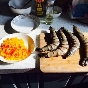将大虾洗净剔除虾线,彩椒红色黄色各半个切成小丁备用。