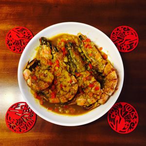 放少许油,将大蒜和彩椒轻轻翻炒。加水,放入咖喱块(我用的好事百梦多的咖喱块)熬成浓酱(此步骤忘记拍照)。最后把虾放入翻炒均匀即可。咖喱块本身有盐,可以尝下汤,如果不够咸可以在放少许盐,喜欢吃辣的也可以买辣的咖喱。