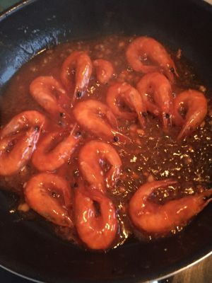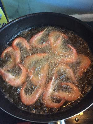 虾洗净剪去须爪!控干水分放热油里炸变色,捞出控油!