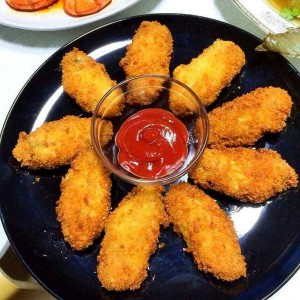 锅坐油烧至四成热,下入裹好面包糠的鸡翅中炸至金黄色捞出摆盘。配一碟番茄沙司。