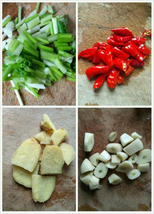 切配料。小米椒,蒜瓣,生姜片,葱段备好待用