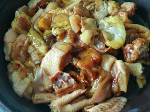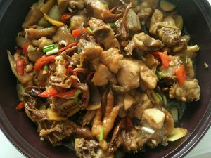 微波炉焖14分钟。将腌制好的鸡块放入塔吉锅,姜片,蒜瓣,米椒一起放在上层,放入微波炉14分钟后撒上葱段即可。