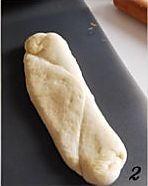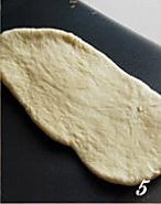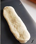 把擀好的椭圆形长条翻面,从上而下卷起,静置10分钟