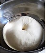 面团放入盆中,盖上保鲜膜,室温发酵2倍大,一般来说普通的面团在室温28度下,发酵约耗时1小时左右。测试发酵好的面团用手指沾高粉插入面团中,面团手指孔不回缩即发酵好