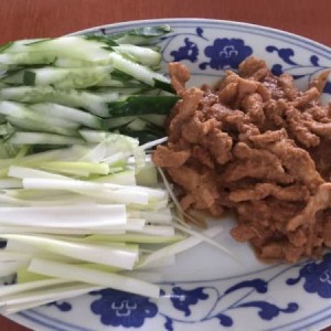 豆腐皮切成正方形,放入烧开的水中煮开,捞出放凉,拿一张豆腐皮,夹一筷子肉丝,黄瓜丝,大葱丝,卷起来就大口吃吧,味道好极了!