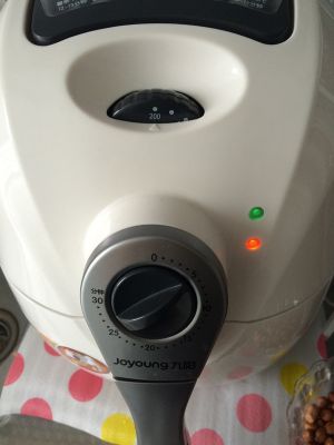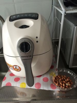 六分钟后,花生刷一层油,或者直接倒入一点点油,晃悠炸篮也可以,花生表皮有淡淡的一层油就可以了