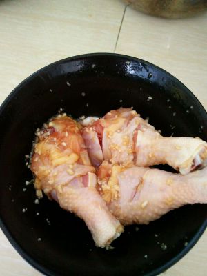 鸡腿洗净两面划刀,放入蒜蓉,蚝油,酒,一点点芝麻油腌制十分钟