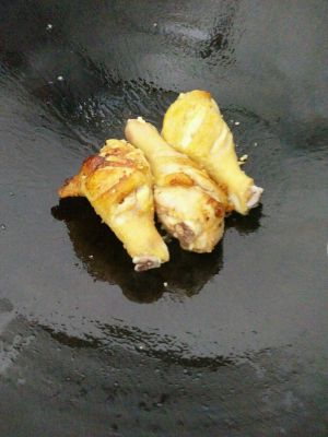 锅里放少量油烧热,把鸡腿放进油锅里煎至两面金黄