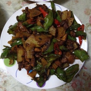 转小火,剩余的油放甜面酱煸炒,炒一会把鸡混合炒,倒入少许醋,老抽上色,盐,土豆翻炒。放入辣椒,蒜片,炒一会