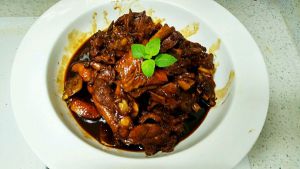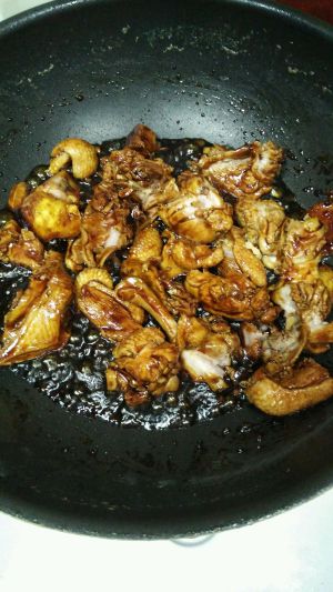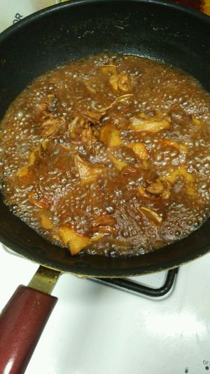 换炒锅,鸭肉比较肥没有放油。锅热后把之前焯水的鸭肉放入,炒几下把料汁倒入,翻炒入味加入高汤。没有就加开水。姜片葱段倒进去。