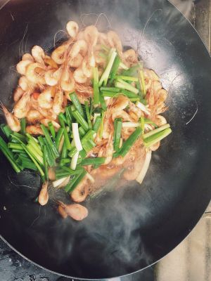 海虾变红放入香葱辣椒继续炒,炒到水分干了,根据个人口味加盐,鸡精可以不加了,因为海虾很鲜。