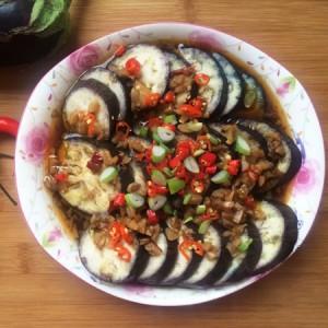 将炒好的蒜蓉浇在茄子上,撒上一半的辣椒圈,开水上锅蒸20分钟。