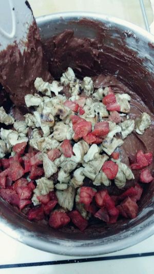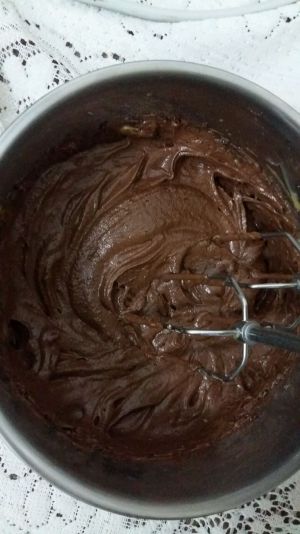 三个鸡蛋在另一个碗里打散后分五次加入巧克力糊里打均匀