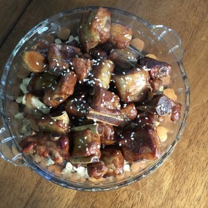水要没过排骨,先大火烧开,再转小火,我记得妈妈跟我说澳洲的排骨比较容易熟,国内的排骨可能要多加几次水吧!到汤汁快没了的时候转大火收汁,直到只看到油,没有汤汁为止!最后装盘撒熟的白芝麻