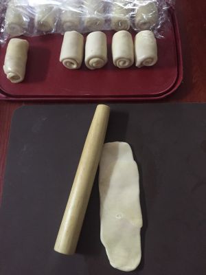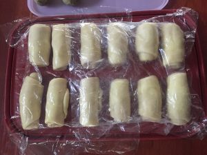 醒好后继续用擀面杖擀成长方形,由下往上卷好,盖上保鲜膜再醒15分钟