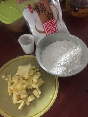 制作油酥:清水10克、黄油60克加入醒了一夜的白面胚子10克、面粉100克一起放入搅拌桶中,和好的酥团铺上保鲜膜醒30分钟