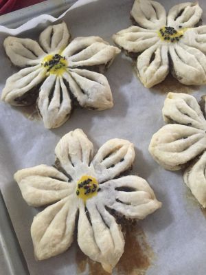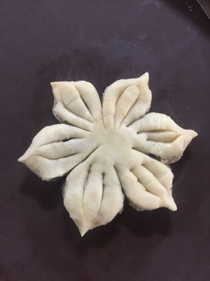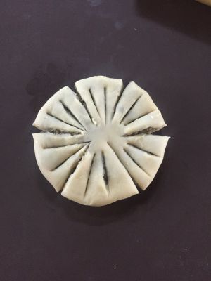 拿出擀成边薄里厚的片包入豆沙馅儿,擀成圆形。用锋利的刀子切成6份,注意圆中间千万不能切断,再在每等份中间切两个小口,切到看到馅料就好,不要切到底