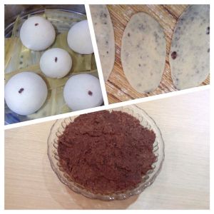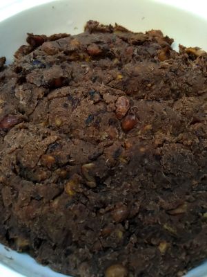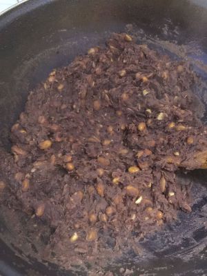 这次水放的比例碰巧刚刚好,豆子煮熟后锅里几乎没有剩下多余的水,这样的状态是最好的,否则炒得时候需要多花一些时间。炒锅内倒入少许油,油温上来之后,加入煮好的豆子,小火开始翻炒,像做果酱一样用铲子不断搅动,当然,做完后胳膊和手会很累。红豆容易搅烂,黄豆虽然软了但是就是不散,所以我中间停火再一次补救--用电动打蛋器搅拌了一会儿。