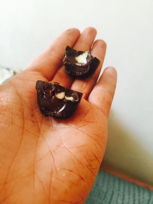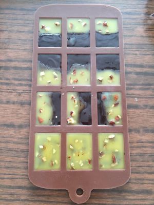 我在网上买的这个硅胶模具,也是先用裱花袋把黑色可可挤在花纹上,再把白色可可倒进去,放个大果仁!再把白色可可倒满模具。