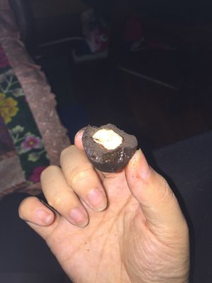 第一次做的,微苦。里面整颗的榛子仁。后来做夹心放进去过整颗的夏威夷果。