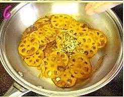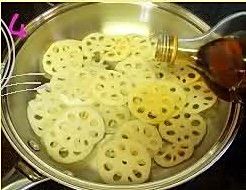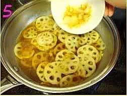 锅里加少许油放入藕片煸炒,喷入少许料酒;