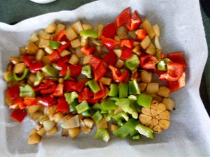 烤盘垫一层蜡纸或者锡纸都行,铺上土豆,辣椒