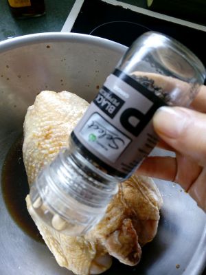 酱料倒入盆里,现磨些胡椒粉一起,按摩按摩鸡,再腌制,至少两小时以上,我是早上腌,下午烤。