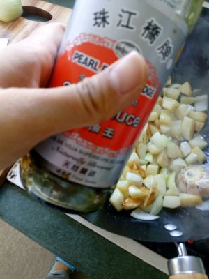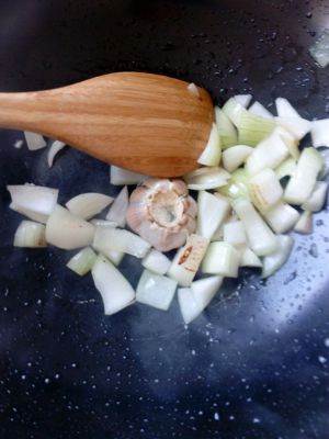 锅热,少许油,洋葱切方块下锅,蒜头切中间一刀,下锅炒香