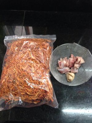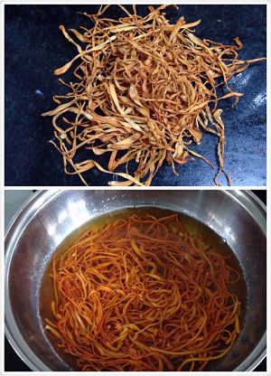 约50克虫草花放入温水中泡半小时至软,泡软后要煮之前,将泡出来的黄渍倒掉,过两遍清水。