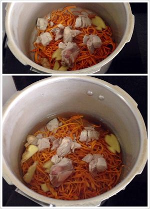 把东西都放入高压锅,加入适量的盐和水,水满过食材就可,然后加盖开大火,待到高压锅的警报阀响起,让声音持续一分钟左右再转小火稍焖,揭盖后加入适量的味精。