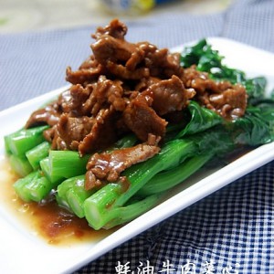 下油热锅,放入姜片爆香,放入腌制好的牛肉,大火翻炒约2分钟,倒入以生粉、蚝油兑好的调味汁,让汁充分裹住牛肉后,把牛肉铺在菜心上面即可。
