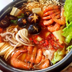 准备好食材,该洗的洗好,该切的切好。虾类处理一下,热水烫一下,如果有其他肉类用盐、辣椒粉、料酒腌制好。